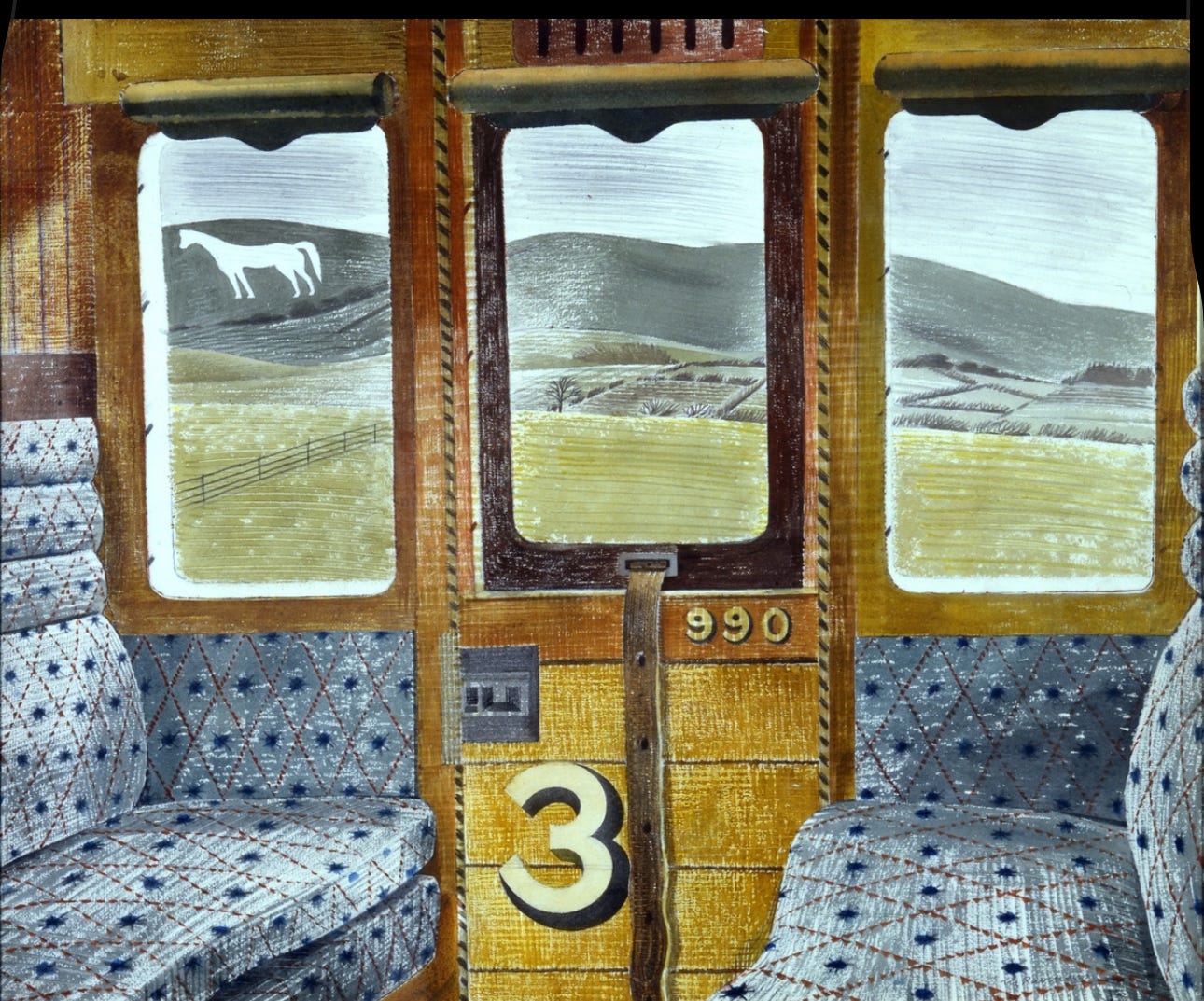 The painting is a collage which was created by Ravilious’s wife, Tirzah Garwood, who used elements taken from several of these train journey sketches. The artist’s family clarified that the White Horse image was a composite view.